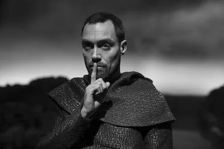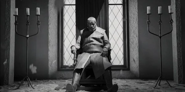 Coen builds on the revisions of the 1971 version and turns Ross into a fully realized character who’s essential to the plot and themes of the film. The changes set in place by Polanski’s version are retained and enlarged upon. Ross is costumed differently than the other Scots, in monkish robes that establish him as the religious arm of the throne (infer what you will about the relationship between religion and power). Ross is always placed just at the edge of the frame, listening, and Alex Hassell’s outwardly obsequious performance exudes an undertone of menace. Act 2 Scene 4, which in the text serves only as exposition, is rejiggered to imply a connection between Ross and the Witches. In it, after Duncan is killed and Macbeth throned, Ross and an Old Man share stories of nightmarish events in Scotland now that nature has been thrown out of balance by the murder of a king. Their speeches were written only to provide a sense of the state of Scotland under Macbeth, but Coen has Kathryn Hunter play the Old Man as another manifestation of the Witches, and her and Hassell’s line readings convey a sick pleasure in the evils they describe.